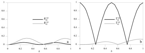 In the high- (2hf = 4 MHz mm) frequency height regime, SH0, SH1 and SH2 waves could, in principle, propagate (Figure 2). For an A-type discontinuity, the dependence on obtained from the analytical model of , , and for is presented in Figure 10. Similarly to that occurring at low frequencies, we observed a periodic pattern in all the scattered components. The normalized spatial period, which was for the SH0 mode, is longer for the SH2 mode, as this has a larger wavelength.