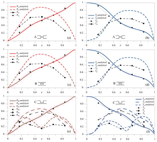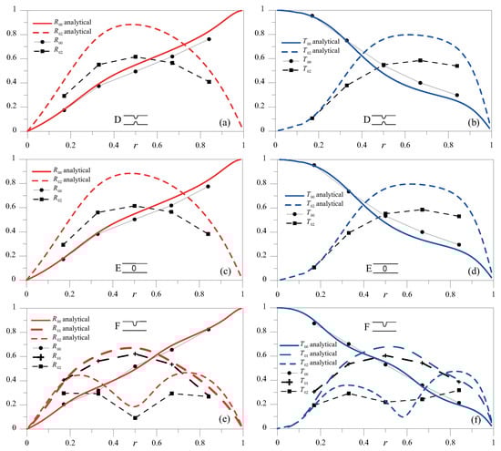 For , with the SH0 mode incident, Figure 11 and Figure 12 show the coefficients of reflection and transmission of the three modes involved for all the discontinuity shapes under investigation, together with the analytical solution obtained using the principle of reciprocity for the A-type discontinuity. It can be observed that, when SH0 wave encountered a symmetric discontinuity (cases A–E), only the SH0 and SH2 modes were found in the scattered response, whereas if the discontinuity was asymmetric (cases C and F), the SH1 mode also emerged. Similarly to that occurring for = 1 MHz mm, the numerical results closely resembled the analytical results, and, more importantly, the scattered field had the same amplitude for coupled cases A–B and D–E; that is, it did not depend on the notch profile.