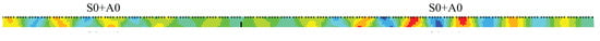 For Rayleigh-Lamb modes, the analysis was limited to the low- ( MHz mm) frequency height regime, which already contains a symmetric S0 and an asymmetric A0 mode. Figure 13 reports an FE qualitative description of the interaction of the S0 mode with a symmetric A-type discontinuity. This figure reports a contour plot of displacements at a time step following the interaction between the incident mode and the discontinuity. It shows that when S0 waves encountered an A-type symmetric discontinuity, the scattered response contained only the S0 mode, as the A0 mode was not required to satisfy the boundary conditions. In contrast, when S0 waves encountered a nonsymmetric C-type discontinuity, the response contained both the incident S0 and the nonsymmetric A0 mode, which was then necessary to satisfy the boundary conditions. The evidence for this statement is given in Figure 14, which shows the displacement field at a time step after the S0 mode had encountered a nonsymmetric discontinuity. The interaction of the S0 mode with symmetric discontinuities is presented first, followed by the interaction with nonsymmetric discontinuities.
