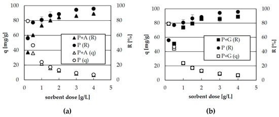 The effect of the sorbent dose on zinc(II) ions sorption on pectin based biosorbents: (a) hybrid pectin biosorbent with agar (P+A); and (b) hybrid pectin biosorbent with guar gum (P + G). (R) percentage of zinc removal [%], (q) sorption capacity [mg/g].