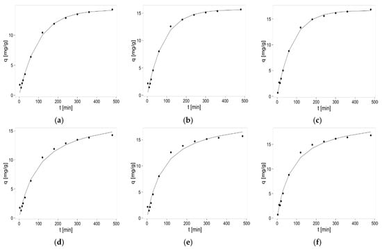 The studies were performed as described in general procedure (Section 3.3), but 500 mL of solution of initial Zn(II) concentration 30 mg/L and 0.75 g of pectin-based beads was utilized. Samples of 0.1 mL were collected after 1, 3, 10, 15, 20, 30, 60, 120, 180, 240, 300, 360, and 480 min. The change of solution volume during experiments caused by sample taking was neglected. This was only 0.26% solution lost during whole experiments.