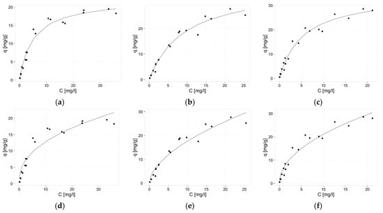 The studies were performed as described in general procedure (Section 3.3), but 20 mL of solutions of various concentration (1–60 mg/L) and 0.03 g of biosorbents were used.