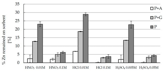 Comparison of zinc(II) ions desorption from pectin-based biosorbents (P + A—hybrid pectin biosorbent with agar, P + G—hybrid pectin biosorbent with guar gum, P—sole pectin biosorbent) using various acid solutions of various concentration. Mass of sorbent 0.03 g, volume of solution: 0.01 L, pH = 6, temperature 22 ± 1 °C, time of contact 24 h.