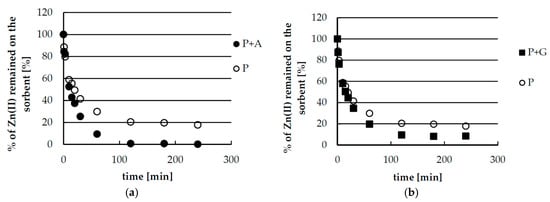 The effect of sorbent dose on zinc(II) ions sorption is shown in Figure 1. Applying the lowest sorbent dose (0.2 g/L), the highest sorption capacities were obtained (about 80, 80, and 60 for P, P + G, and P + A, respectively), but the percentage of zinc removal in such conditions was significantly lower: about 60, 60, and 40 for P, P + G and P + A, respectively, due to high excess of metal(II) ions. This high excess enabled to fill all the active sites, thus, the sorption capacity at low dose of sorbent was high. At high dose of the sorbent, the majority of metal ions were adsorbed, but some active sites remained unsaturated, which resulted in decrease of the sorption capacity of metal ions per unit mass of adsorbent and increase of percentage of zinc removal. In the experimental conditions, the highest zinc removal was achieved at the sorbent dose ≥ 3 g/L (above 90% for sole pectin and almost 90% for hybrid sorbents), but the sorption capacities were in this case low (7–9 mg/g). At sorbent dose of 1.5 g/L, the zinc removal percentage was still high (above 80%), but the sorption capacity grew twice (almost to 20 mg/g). Therefore, the dose of 1.5 mg/g was chosen and used in further studies.