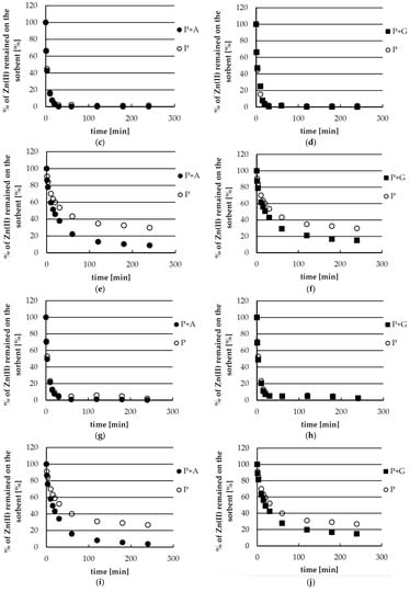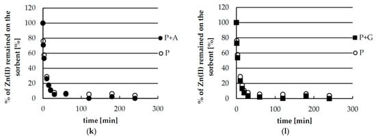Kinetics of zinc(II) ions desorption from pectin-based biosorbents (P + A—hybrid pectin biosorbent with agar, P + G—hybrid pectin biosorbent with guar gum, P—sole pectin biosorbent) using various acid solutions of various concentration: (a,b) 0.01 M HNO3; (c,d) 0.1 M HNO3; (e,f) 0.01 M HCl; (g,h) 0.1 HCl; (i,j) 0.005 M H2SO4; and (k,l) 0.05 M H2SO4. Mass of sorbent 0.75 g, volume of solution: 0.25 L, temperature 22 ± 1 °C.