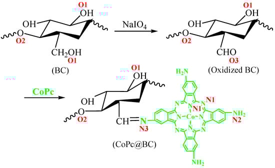 To prepare CoPc@BC, the following steps were taken. First, 20 mg of freeze-dried BC membrane was submerged into deionized water overnight, and then oxidized with NaIO4 solution at different concentrations elevated from 10 mmol/L to 50 mmol/L, the oxidation process was performed in a shaking water bath. The oxidized BC membrane containing aldehyde groups was thoroughly washed by ultrapure water and dried at 60 °C under vacuum. The dried membrane was suspended in a 200 μmol/L CoPc solution and reacted for 3 h at 25 °C, the product was washed several times with dimethylformamide (DMF) to eliminate residual CoPc, and then rinsed three times with ultrapure water. All the schematic functionalization processes are given in Figure 1. The influence of different reaction parameters, i.e., NaIO4 concentration, oxidation time, and reaction temperature, on the immobilized amount of CoPc was systematically studied. The aldehyde groups’ content on the oxidized BC was determined according to the literature, with minor modification [34,35]. An accurately-weighted 0.020 g oxidized BC was added to a 10 mL hydroxylamine hydrochloride solution at 50 °C for 2 h under stirring, the resulting mixture was titrated with 0.050 mol/L HCl solution with phenolphthalein as an indicator. A blank titration without oxidized BC was conducted under the same conditions. The aldehyde groups’ content of the oxidized BC was calculated as follows: