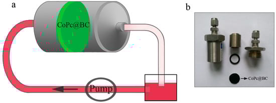 (a) Schematic representation of the CoPc@BC-based catalytic membrane reactor (CMR); (b) Optical image of the CoPc@BC-based CMR.