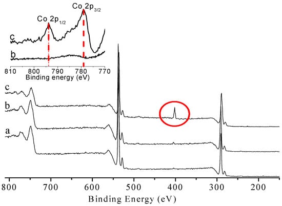 XPS was also performed to analyze the chemical composition of the BC surface during the series of modification [16]. For the as-prepared BC (Figure 3a), the two characteristic peaks at 284.6 eV and 533 eV were ascribed to the binding energy of C1s and O1s, respectively. The oxidation process did not significantly change the XPS spectrum of the BC membrane (Figure 3b). Upon the immobilization of CoPc molecules onto the oxidized BC, an additional new peak at a binding energy of ca. 400 eV was observed (Figure 3c), which was the characteristic peak of N1s. Furthermore, two new signals at binding energy of 779.1 eV and 793.9 eV were also detected (Figure 3, inset), which were assigned to the characteristic peaks of Co 2p3/2 and Co 2p1/2, respectively. These results provide further evidence for the immobilization of CoPc onto BC and the successful preparation of CoPc@BC.