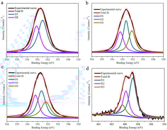 Curve fit of (a) O1s peaks of BC; (b) O1s peaks of oxidized BC; (c) O1s peaks of CoPc@BC; and (d) N1s peaks of CoPc@BC.