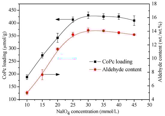 The effect of NaIO4 concentration on the CoPc loading was assayed within the concentration range from 10 mmol/L to 45 mmol/L, and the typical result is shown in Figure 5. Both the aldehyde groups’ content and the CoPc loading increased rapidly with NaIO4 concentration. To provide more binding sites for CoPc immobilization, a sufficient amount of oxidizer (NaIO4) must be applied to maximize the yield of the aldehyde groups. The CoPc loading was less than 200 μmol/g with 10 mmol/L NaIO4. When NaIO4 concentration increased to 30 mmol/L, the aldehyde groups’ content of the oxidized BC increased from 5 to 14 wt./wt.% and, accordingly, the CoPc loading was as high as 430 μmol/g. However, a further increase of NaIO4 concentration results in the slow decrease of CoPc loading. This phenomenon can be attributed to two reasons. Firstly, under a very high concentration of NaIO4, a portion of the formed aldehyde groups were likely to further oxidize to carboxyl groups [40], reducing the binding sites which can readily react with CoPc, thus leading to a slightly lower level of CoPc loading. This result is in accordance with the gradual decrease of the aldehyde groups’ content under very high NaIO4 concentrations (Figure 5). The second explanation is related to the gradual degradation of cellulose chains with the high concentration of NaIO4 [36], which is quite possible for the very large surface to volume ratio of BC.