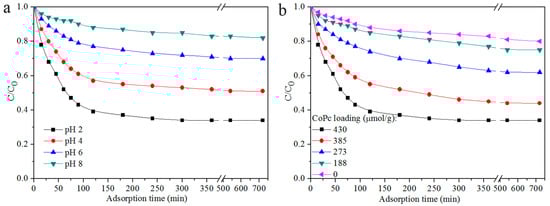 Concentration changes of reactive red X-3B (initial concentration: 1 × 10−4 mol/L, T = 50 °C) with CoPc@BC (1.60 mg) adsorption: (a) effect of pH; and (b) the effect of CoPc loading.