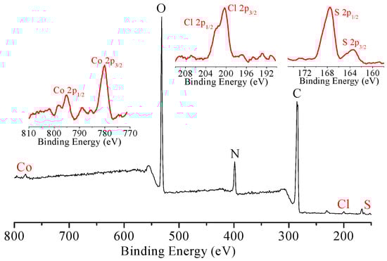 XPS of the cross-section of CoPc@BC after dye adsorption. Left inset: detail of the Co region, middle inset: detail of the Cl region; and right inset: detail of the S region.