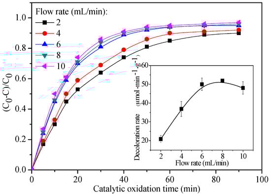 Therefore, a flow rate of 6 mL/min, together with the reaction temperature of 50 °C and H2O2 concentration of 10 mM, were required for this high-performance CMR. Under these optimal operating conditions, the decoloration rate of the CMR was ca. 50 μmol⋅min−1⋅g−1. The catalytic oxidation efficiency of the present CMR is much higher compared with the related literature we reported previously [32,42].