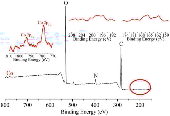 The composition of cross-section of CoPc@BC after catalytic oxidation was analyzed with XPS (Figure 9). The two peaks corresponding to Co 2p3/2 and Co 2p1/2 remains can be detected after reaction. However, almost no signal was observed in the range of binding energy between 210 eV and 160 eV (the position of characteristic peaks of S and Cl), which indirectly verified that the adsorbed dye molecules were successfully catalytically oxidized. A similar result was obtained for the XPS of the surface composition of CoPc@BC (data not shown).