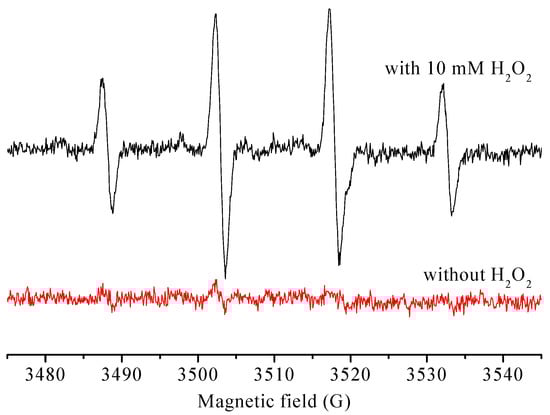 The EPR spin-trapping technique was applied to monitor the formation of reactive species which are responsible for the catalytic oxidation of reactive red X-3B by CoPc@BC/H2O2 reaction system. As shown in Figure 10, no signal was observed without the addition of H2O2. However, obvious signals with four peaks were generated when 10 mM of H2O2 was added, which are the typical characteristic peaks of DMPO-OH adducts [43], indicating the involvement of highly-reactive ⋅OH during the catalytic oxidation process.