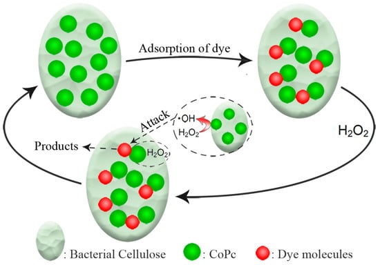 To improve the catalytic activity of MPc, a specific microenvironment provided by the support is essential. Several factors should be considered for the appropriate choice of the support: capacity to readily introduce functionality for anchoring, the degree of functionalization, the possible involvement with the reaction, the stability of the support under reaction conditions, and the availability of the support [1]. Among all of the supporting materials available for MPc immobilization, the bacterial cellulose (BC) membrane stands out due to several attractive characteristics [14,15,16,17]: it has a very large surface-to-volume ratio with easily tunable hydroxyls groups, thus, high MPc loading is, therefore, reasonably expected. It is produced in membrane form, the web-like network with a distinct tunnel and porous structure allowing the substrate to be readily accessible to reaction sites under very low diffusion resistance. In addition, BC is relatively stable under reaction conditions and is easily recoverable from the reaction media.