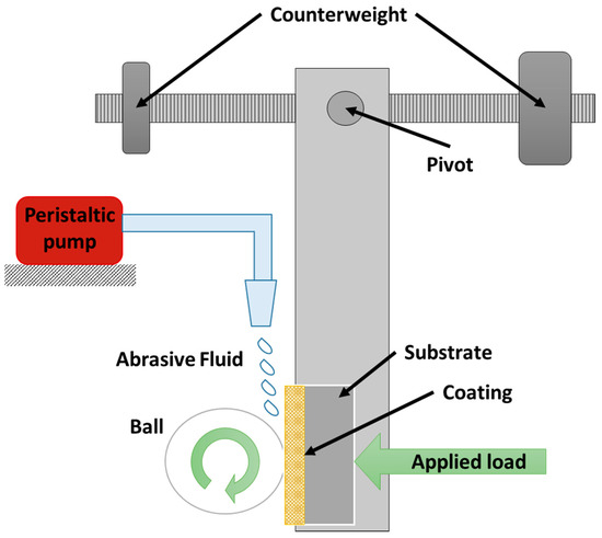 The micro-abrasion test was carried out in equipment that allows the simulation of the wear between two contact surfaces. The apparatus has a lever arm in which the sample is held and a fixed sphere between two coaxial axes. Through the movement of the counterweight, it is possible to regulate the load applied to the surface and the sphere, which is rotated by a DC motor with an encoder that guarantees control over the speed and number of cycles performed. Furthermore, a peristaltic pump adds a third body in the form of abrasive particles suspended in a solution to generate the micro-abrasive processes, as shown in Figure 1.