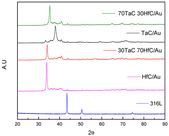 Regardless of the varying deposition parameters, the crystalline phase of Hf2Au1 tends to replicate in both the pure HfC/Au samples, as well the 30TaC-70HfC/Au samples, and also the Ta4C3.04 phase was identified for the coatings of TaC/Au and 70TaC-30HfC/Au.