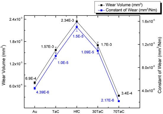 The coating of 70Tac 30HfC/Au shows the lowest constant wear value, followed by the gold sample, indicating a superior behavior against the micro-abrasion wear compared with the other systems. On the other hand, the coatings’ performances of TaC, HfC, and 30TaC 70HfC were similar, where the highest value was exhibited by the HfC sample. Nevertheless, all of the coatings showed values in their constants lower than 10−4, which indicated great performance since the wear was moderate [35].