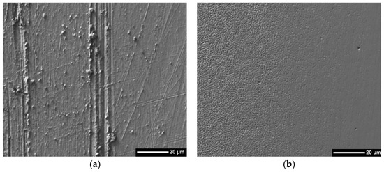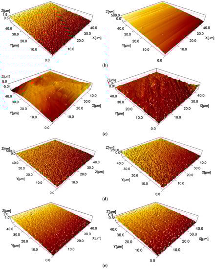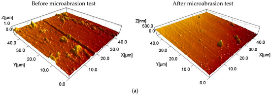 The surface was observed by a JEOL NeoScope JMC-5000 scanning electron microscope operating under high vacuum at 10 kV. Superficial roughness was evaluated by measuring the arithmetic average of the roughness profile (Ra) through a NaioSurf atomic force microscope reference, and the measurement was carried out with an image size of 46.2 μm × 46.2 μm with a 1 s time/line, a resolution of 256 points/line, and a setpoint of 20 nN using the contact mode with a silicon tip coated with aluminum. The measurements were performed in two different zones: The first zone of analysis was obtained prior to each wear test to characterize the surface. In the second zone, the analysis was carried out in the central area generated by the sphere to identify the wear suffered by the coatings. All of the measurements were repeated three times. Using SPIP Image Metrology software, the images were analyzed to obtain the average roughness for each system before and after the micro-abrasion test [34].