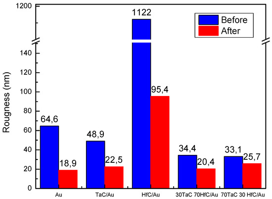 On the other hand, samples of TaC/Au and gold showed a superficial variation considered average as a consequence of a morphological change that eliminated material and homogenized the surfaces. Finally, samples with a combination of TaC-HfC exhibited a slight morphologic change related with the other systems in addition to showing a lower roughness value.