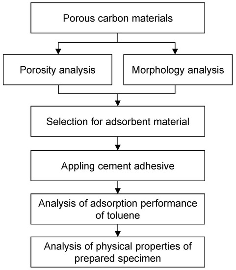 In the preceding research, the adsorption performance of the raw material was mainly evaluated. However, in order to realize actual performance in residential space, it is necessary to study the case applied to building materials. In this study, the selection of the adsorbent materials was based on the porosity and specific surface area analysis of carbon materials using the Brunauer–Emmett–Teller (BET) equation. The adsorption material for the adhesive mortar was analyzed according to the toluene adsorption performance using a 20 L small chamber. The physical properties were tested according to the Korean Standard, KS L 1592 method [21]. The shear bond strength, length change rate, and water retention rate were analyzed for actual usability. Figure 1 shows a flow diagram of the entire experiment.