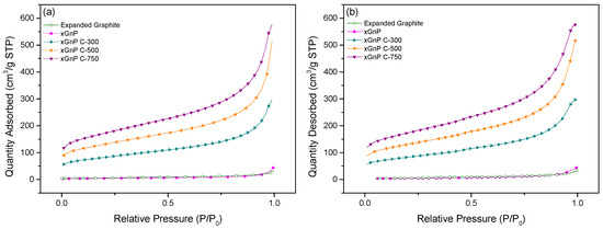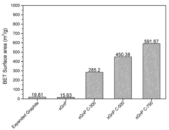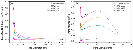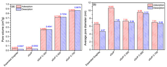 The specific surface area, pore diameter, and pore volume of the porous carbon materials were analyzed by BET analysis. The porous carbon materials were characterized by N2 adsorption at 77 K using a Micromeritics model TriStar 3000 analyzer and were outgassed for 24 h at 573 K to remove any moisture or adsorbed contaminants present on their surface. Figure 2a,b shows the selected adsorption and desorption isotherms of N2 at 77 K for porous carbon materials, respectively. The xGnP and EG were determined to have low adsorption amounts compared with the other porous materials. The xGnP C-300 grade, xGnP C-500 grade, and xGnP C-750 grade materials tended to increase gradually according to the grade. The xGnP C-750 showed the highest level of adsorption and indicated a constant amount of adsorption during the pressure change. Figure 3a,b shows the pore size distribution and pore volume of each porous carbon material. The porous carbon materials have a narrow pore size distribution. The pore sizes were mainly distributed below 10 nm, indicating that the porous carbon materials have a mesoporous pore diameter. The pore volume can be calculated from Equation (1). Figure 3b shows the calculated pore volume. xGnP C-750 has the largest pore volume and xGnP has the lowest.
