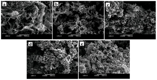 SEM image of porous carbon materials: (a) EG; (b) xGnP; (c) xGnP C-300; (d) xGnP C-500; and (e) xGnP C-750.
