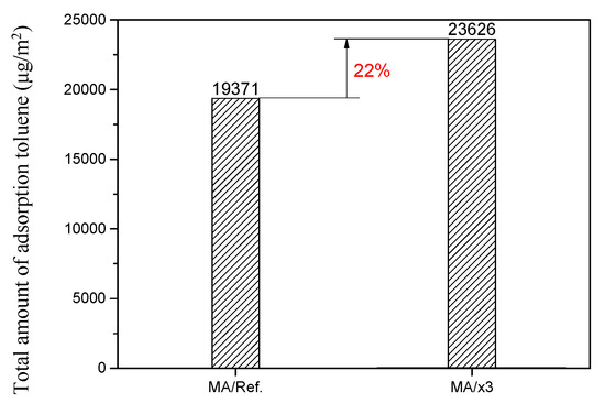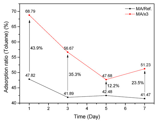 where is the adsorption rate (%), is the supply air concentration with elapsed time (μg/m3), and is the exhaust air concentration with elapsed time (μg/m3). The difference between the supply air concentration and exhaust air concentration can determine the amount of toluene contaminant the specimen has adsorbed. The emission rate of MA/Ref. and MA/x3 were 5.936 and 26.137 μg/m2·h, respectively. The adsorption ratio of MA/Ref. after 1, 3, 5, and 7 days was 47.82, 41.89, 42.48, and 41.47%, respectively. However, the adsorption ratio of MA/x3 after 1, 3, 5, and 7 days was 68.79%, 56.67%, 47.68%, and 51.23%, respectively. As emission rate is high, the result of MA/x3 may be different from the trend of general adsorption ratio. The toluene adsorption rate increased by 28.7% on average after seven days, implying that the xGnP C-500 grade material improves the adsorption performance of the mortar adhesive.