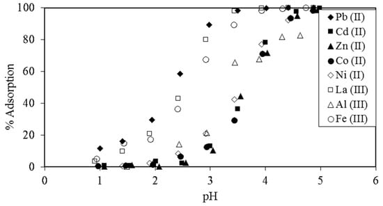 % adsorption of different metal ions by crosslinked lignocatechol gel at different pH values at equilibrium. Initial metal ion concentration = 0.2 mM, dry weight of lignocatechol gel = 20 mg, test solution volume = 15 mL [6]. (With permission for reuse from Elsevier B.V.).