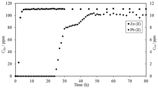 Pb(II) and Zn(II) elution profiles for a column saturated with Pb(II) ions and eluted with 1 M nitric acid solution at a flow rate of 5.5 mL/h [14]. (Copyright 2003 by The Minerals, Metals & Materials Society. Reprinted with permission).