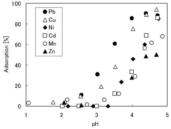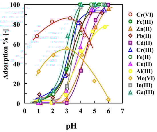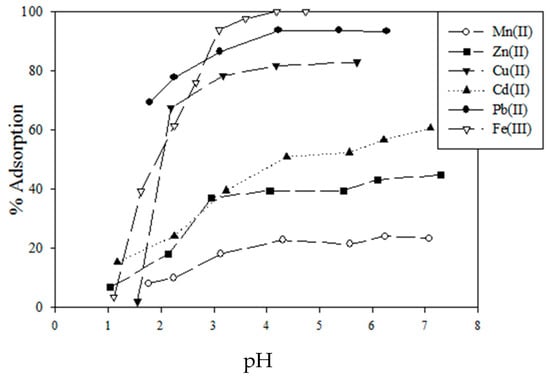 The relationships between the percentages of metal ions in solution that were adsorbed (% adsorption) and the equilibrium pH when some heavy metal cations were exposed to crosslinked lignocatechol gel in a buffer (0.1 M (M = mol/L)) hydrochloric acid and 0.1 M N-[2-hydroxyethyl] piperazine-N’-[2-ethanesulfonic acid] (HEPES), later called HEPES buffer solution, are shown in Figure 1. Here, % adsorption was defined as shown in Equation (1).