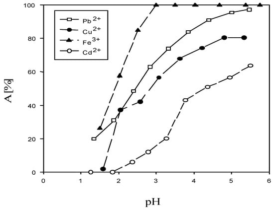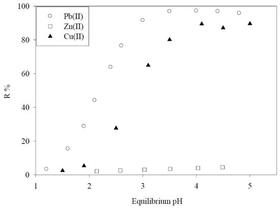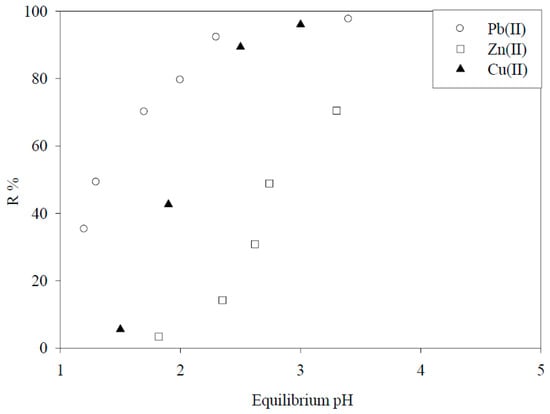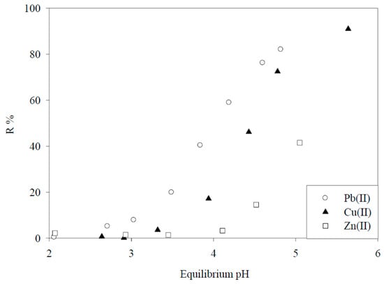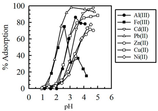 Adsorption of Pb(II), Zn(II) and Cu(II) by DIAION WK11 resin as a function of the equilibrium pH [9]. (With permission for reuse from Elsevier B.V.).
