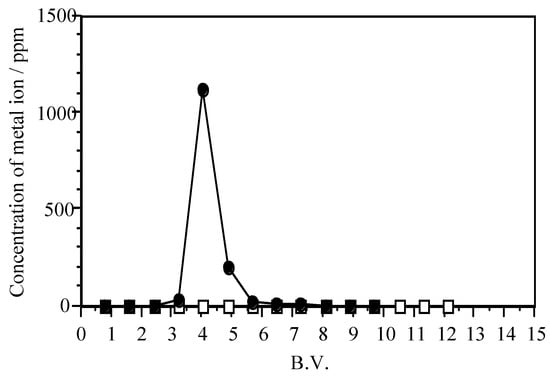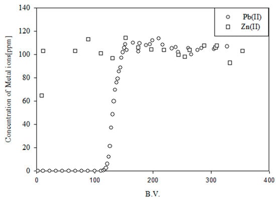 The good separation of Pb(II) and Zn(II) achieved using the crosslinked acidic polysaccharide gels led us to perform separation tests using columns packed with these gels. Pb(II) and Zn(II) breakthrough profiles found when a solution containing 100 mg/L Pb(II) and 100 mg/L Zn(II) was passed through a column packed with crosslinked pectic acid gel are shown in Figure 9. In this and other figures, B.V. (on the horizontal axis) is the bed volume, defined by Equation (2).