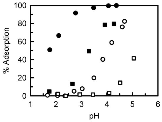 % removal of As through adsorption by iron(III)-loaded SOJR gel and through the conventional coprecipitation method using ferric chloride plotted against equilibrium pH values. ●: Adsorptive removal of As(V) by Fe(III)-loaded SOJR gel. □: adsorptive removal of As(III) by Fe(III)-loaded SOJR gel, ○: removal of As(V) through coprecipitation using ferric chloride [15]. (With permission for reuse from The Mining and Materials Processing Institute of Japan).