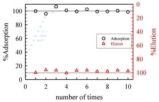 The % adsorption by and % elution of Pb(II) from a column packed with SOJR gel when the column was repeatedly loaded and eluted are shown in Figure 18. It can be seen that 100% of the Pb(II) was adsorbed and eluted when the column was used 10 times, suggesting that SOJR is very durable.