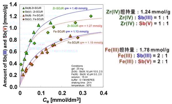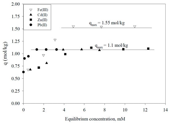 Figure 19 shows the adsorption isotherms of Fe(III), Cd(II), Zn(II) and Pb(II) on SOJR gel. The isotherms suggested that these metal ions are adsorbed through the Langmuire-type adsorption, as was found for other biosorbents mentioned earlier. The maximum Fe(III) adsorption capacity of the SOJR gel determined from the adsorption isotherms was 1.55 mol/kg, and the maximum adsorption capacities for the other three metal ions were all 1.10 mol/kg.