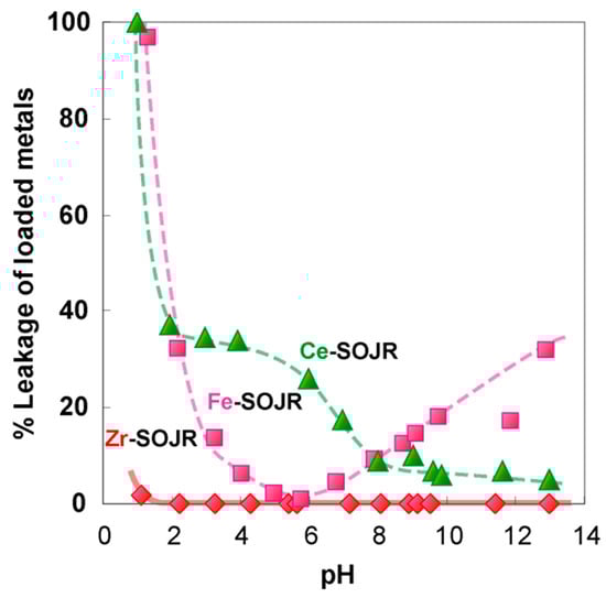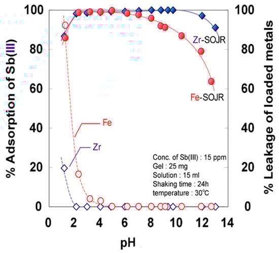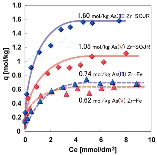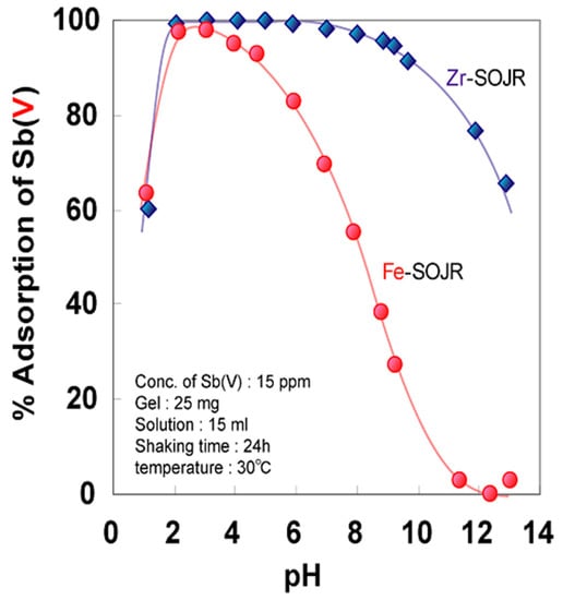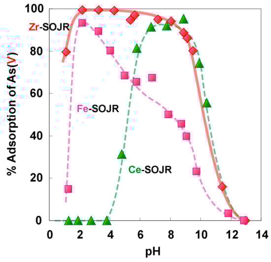 Figure 20 shows the plots of % removal of As (V and III) from a synthetic test solution by adsorption using Fe(III)-loaded SOJR gel and using the conventional coprecipitation method using ferric chloride at different equilibrium pH values [15]. It can be seen that Fe(III)-loaded SOJR gel almost completely removed As(V) over a wide pH range (pH 2–6) and removed more than 80% of the As(III) at high pH value (pH 8–10). The conventional coprecipitation method only removed more than 80% of the As(V) in a narrow pH range (pH 5–6) [15].