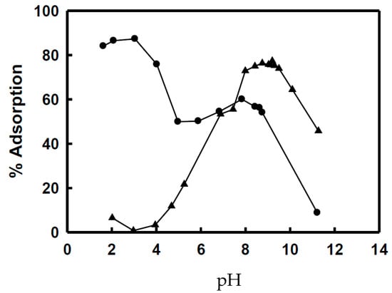 % adsorption of As(III and V) ions by Fe(III)-loaded Laminaria japonica gel crosslinked with epichlorohydrin at different pH values at equilibrium. ● As(V), ▲: As(III).