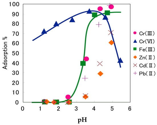 Cr(VI) exists in an aqueous solution as the oxo-anionic species such as HCrO4−, H2CrO4, and CrO42− depending on the pH and total Cr concentration. Figure 34 shows the plot of % adsorption of some metal ions, including Cr(VI) and Cr(III) (another Cr species that is common in environmental media), by crosslinked persimmon gel at different equilibrium pH values. Except for Cr(VI) and Mo(VI), the adsorption of all metal ions existing as cationic species monotonously increased with increasing pH, suggesting that adsorption of these metal ions occurs through cation exchange as shown below, similar to adsorption by the lignocatechol gel.