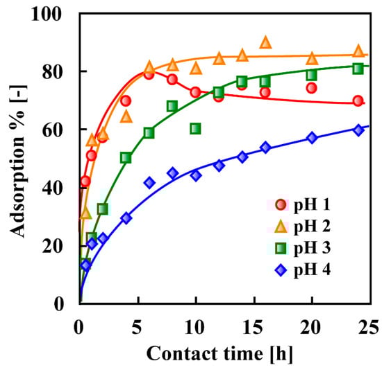 Temporal change in the % adsorption of Cr(VI) by crosslinked persimmon gel at different pH values at 30 °C. Initial Cr(VI) concentration = 13 mM, weight of gel = 10 mg, test solution volume = 10 mL [35]. (With permission for reuse from Elsevier B.V.).