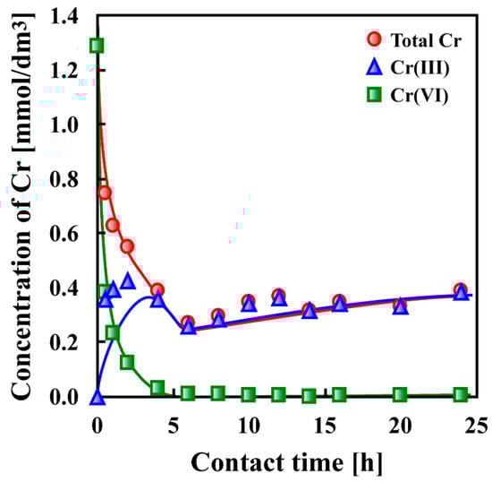 Temporal change in the Cr(VI), Cr(III), and total Cr concentrations at pH = 1 under the same conditions as shown for Figure 36 [35]. (With permission for reuse from Elsevier B.V.).