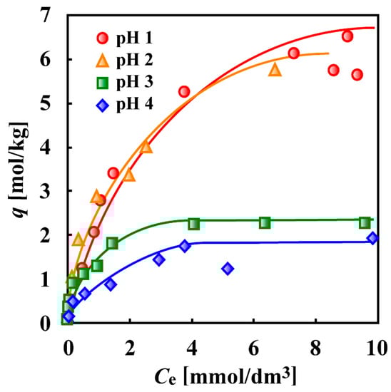 Cr(VI) adsorption isotherms for crosslinked persimmon gel at different pH values at 30 °C. Weight of gel = 10 mg, test solution volume = 10 mL, shaking time = 24 h [35]. (With permission for reuse from Elsevier B.V.).