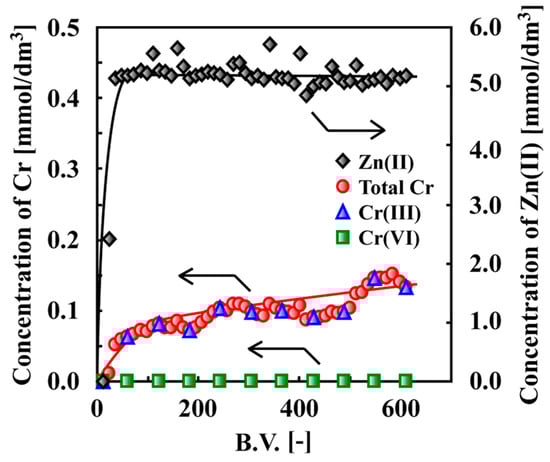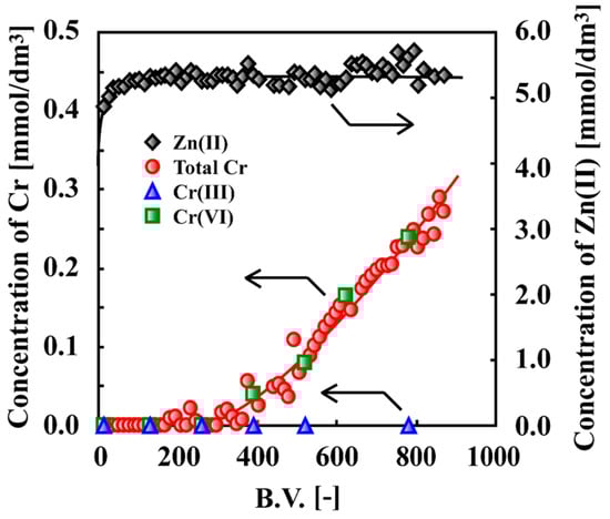 Zn(II) and Cr species breakthrough profiles for a column packed with crosslinked persimmon gel at pH = 1. Weight of packed gel = 150 mg, feed concentration of Cr(VI) = 0.5 mM, that of Zn(II) = 5 mM, flow rate = 6.5 mL/h [35]. (With permission for reuse from Elsevier B.V.).