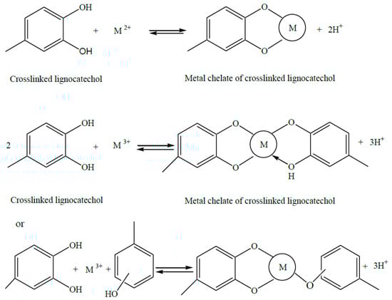 Inferred mechanism through which divalent and trivalent metal ions are adsorbed by crosslinked lignocatechol [6]. (With permission for reuse from Elsevier B.V.).
