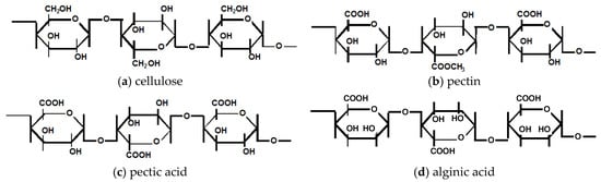 Chemical structures of cellulose, pectin, pectic acid and alginic acid.