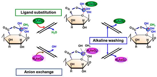 Many hazardous heavy metals and metalloids are found in the environment as oxo-anionic species such as AsO43−. It is difficult to separate these oxo-anionic species from other anionic species such as sulfate, which are also usually present in environmental media, using conventional anion exchange materials because of the well-known Hoffmeister anion exchange principle series related to the hydration energies of anionic species [10]. Oxo-anionic species have been removed using cation exchange resins loaded with multi-valent metal ions such as Fe(III), which have strong affinities for oxo-anionic species. As mentioned earlier, crosslinked pectic acid and alginic acid gels have strong affinities for multi-valent metal ions such as Fe(III), so we attempted to use these biosorbents loaded with multi-valent metal ions to selectively remove hazardous oxo-anionic species. The concept is shown schematically in Scheme 7 [11].