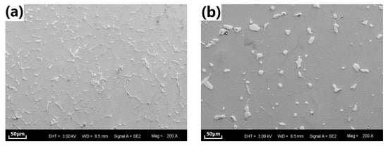 Figure 1 shows typical SEM microstructure of the substrates in as-cast alloy and SS-treated alloy, respectively. The as-cast alloy shows two major microconstituents: α-Mg phase with relatively small grain size and secondary phases. According to our previous work, the secondary phases have been identified as Ca2Mg6Zn3, Mg2Ca, and Mg12CeZn phase, which are net-like and distributed along the grain boundaries of the α-Mg phase [28]. In contrast, the α-Mg phase grains are larger in the SS-treated sample. Meanwhile, the former secondary-phase net structure was changed to isolated secondary-phase particles. Those particles were coarse and distributed both inside of the α-Mg grains and along the grain boundaries. During the heating, secondary-phase particles were triggered to diffuse to the α-Mg grains leading to their disappearance and their decrease in volume fraction. Determined by image analysis via MATLAB (MathWorks, Natick, MA, USA), the secondary-phase volume fractions of the as-cast and ss-treated alloy are 3.4% and 2.5%, respectively. Meanwhile, the remaining secondary-phases tend to agglomerate as coarse particles in order to reduce the interface energy.