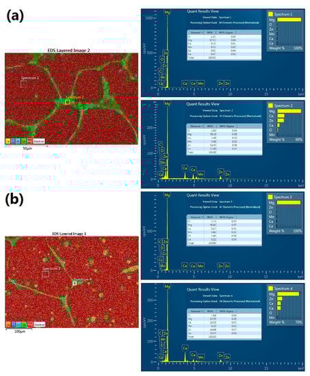 EDS analysis was conducted to study the elements distribution change in the alloy after SS treatment. As shown in Figure 2a, the chemical content of the α-Mg phase is about 97.31 Mg, 0.83 Zn, 0.33 Mn, 0.1 Ca, and 0.07 Ce (wt %) and the chemical content of the primary secondary phase is about 58.19 Mg, 16.45 Zn, 0.26 Mn, 5.69 Ca, and 17.49 Ce (wt %) in as-cast alloy. While in Figure 2b, the chemical content of the α-Mg phase is about 96.43 Mg, 1.46 Zn, 0.46 Mn, 0.27 Ca and 0.22 Ce (wt %) and the chemical content of the primary secondary phase is about 62.53 Mg, 14.84 Zn, 0.1 Mn, 10.33 Ca, and 10.57 Ce (wt %) in SS-treated alloy. Clearly, the alloying-element atoms diffused from the secondary phases into the α-Mg phase during the treatment. As a result, the alloying-element contents were increased in α-Mg phase but decreased in the residential secondary-phase particles while the Mg content changed oppositely. Moreover, the composition gap between the α-Mg phase and secondary phases is slightly reduced in the SS-treated alloy.