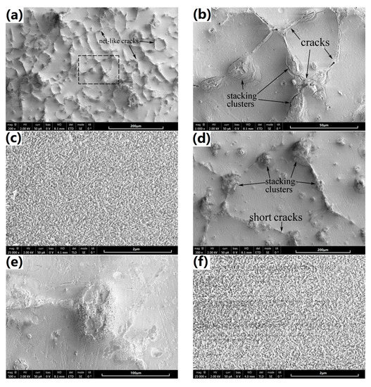 Figure 4 shows the SEM surface morphologies of the coatings synthesized on the cast and SS-treated substrate alloy. As seen in Figure 4a (low-magnification) and Figure 4b (local high-magnification from the mark region in 4a), the coating on the cast alloy (named cast-coating briefly) presented net-like cracks. Particularly, these cracks appear more likely along the α-Mg phase grain boundaries or the secondary-phase net structure. Additionally, the specific stacking clusters are observed to primarily distribute on the secondary phases. Those stacking clusters are loose so that cracks prefer to originate from them. On the other hand, the coating layer on the α-Mg matrix is more compact, and free of micro cracks, as shown in highly magnified image in Figure 4c. The coating layer is composed of nano-scale structures, which are reported as hexagonal flake Mg(OH)2 crystal units before [25,27]. In contrast, only a few short cracks can be found in the coating on the SS-treated alloy (named SS-coating briefly), which is shown in Figure 4d with the same magnification to Figure 4a. Interestingly, the stacking clusters distribute not only on the α-Mg grain boundaries, but also inside the grain in SS-treated alloy. Given the SEM observation in Figure 1b, it is speculated that the stacking clusters inside the α-Mg grains are generated on the remaining secondary-phase particles. Note that the stacking clusters are generally larger than their counterparts in as-cast alloy. This is reasonable since secondary-phase particles are relatively large in the SS-treated alloy. As shown in Figure 4e, no obvious micro-cracks can be found on the stacking clusters, which show better compactness than that of cast-coated sample. Figure 4f shows that the coating layer on α-Mg matrix exhibits very similar microstructure to that in the cast-coated sample. Based on the above description, one can confirm that the cracks are significantly decreased on the SS-coating, which endows its better compactness.